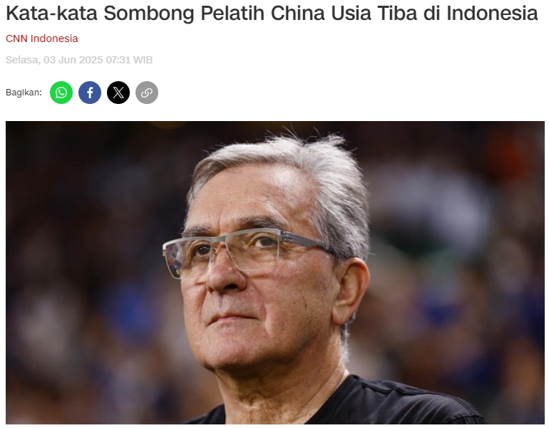 對此,印尼媒體CNN Indonesia以“中國隊主教練抵達印尼后放狂言”為題發(fā)文,全文如下: