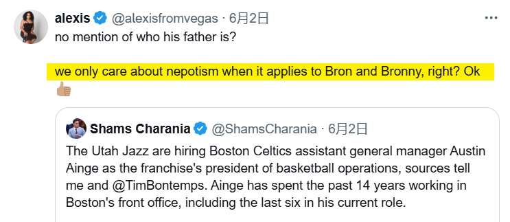 媒體人Alexis就批評(píng)Shams說:“不提他的爸爸是誰?所以我們只在勒布朗和布朗尼身上才談?wù)摗箮шP(guān)系’是嗎?OK??”