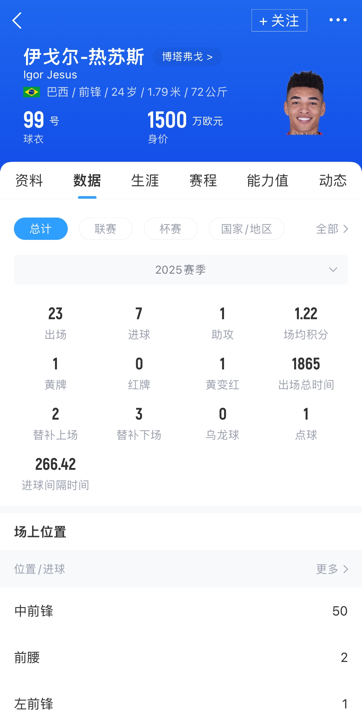 熱蘇斯在去年年中以自由身加盟博塔弗戈,此前他曾效力于迪拜國民。他在本賽季的27場(chǎng)比賽中打入7球并有1次助攻。在為博塔弗戈效力的11個(gè)月,熱蘇斯贏得了兩個(gè)重要冠軍:巴甲冠軍和南美解放者杯冠軍。他貢獻(xiàn)了15個(gè)進(jìn)球和6次助攻。目前,該球員的德轉(zhuǎn)身價(jià)估值為1500萬歐元。