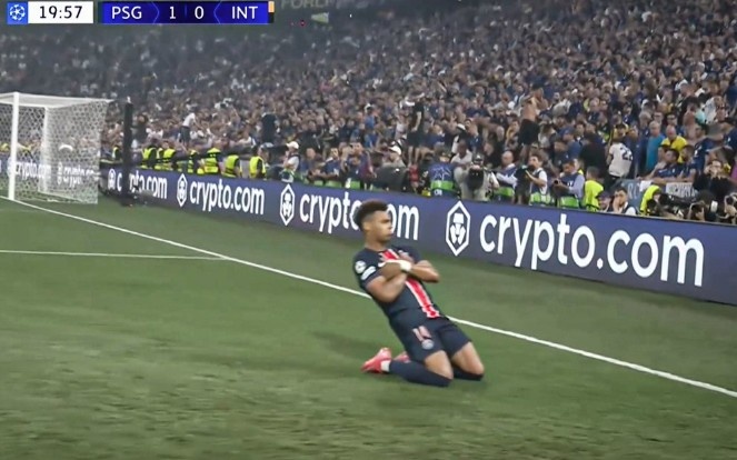 6月1日訊 歐冠決賽,巴黎暫時2-0領先國米。杜埃破門后模仿姆巴佩的慶祝方式,目前巴黎奪冠形勢大好。