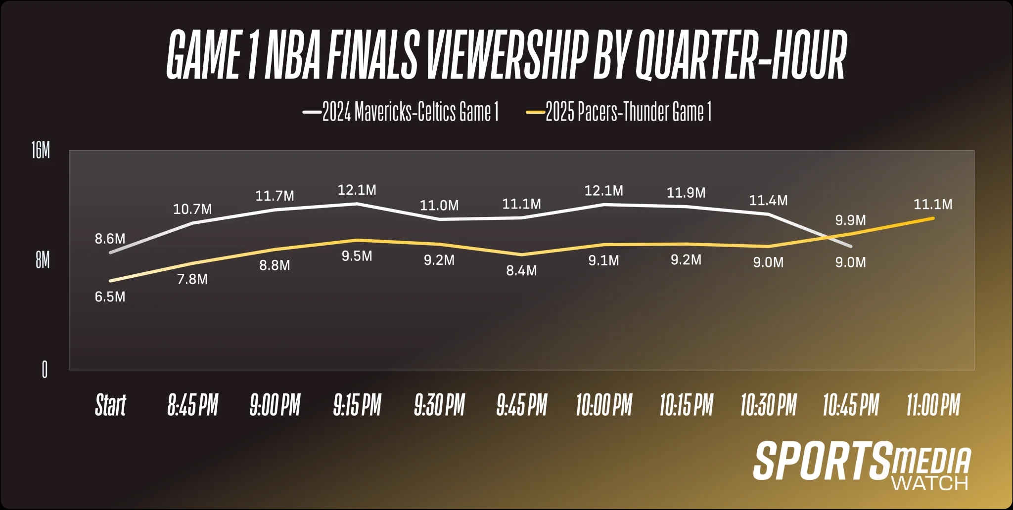 與去年獨(dú)行俠對(duì)陣凱爾特人的總決賽G1相比(5.7%,1099萬(wàn)):今年的收視率下降了18%,觀眾人數(shù)下降了19%。若非步行者末節(jié)逆轉(zhuǎn),跌幅可能會(huì)更大。美國(guó)東部時(shí)間晚上10點(diǎn)45分開(kāi)始的15分鐘時(shí)段之前,觀眾人數(shù)比去年同期下降了23%(從1120萬(wàn)降至860萬(wàn)),但之比賽最后幾分鐘,觀眾人數(shù)相比去年凱爾特人大勝的最后幾分鐘(900萬(wàn))反而增長(zhǎng)了15%,達(dá)到1040萬(wàn)。