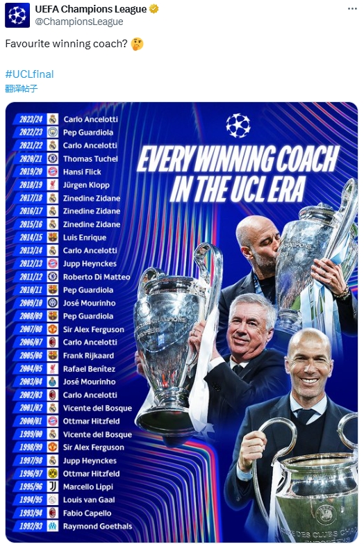 歐冠官方列出92/93賽季-23/24賽季的歐冠冠軍主帥,發(fā)問(wèn):你最喜歡哪一個(gè)?