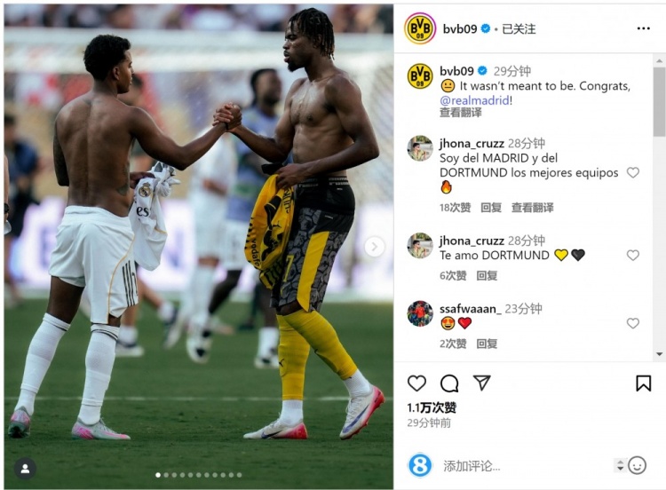 多特官方社媒曬出球員賽后相互致意的照片,并寫道:“未能如愿(晉級),祝賀皇馬!”