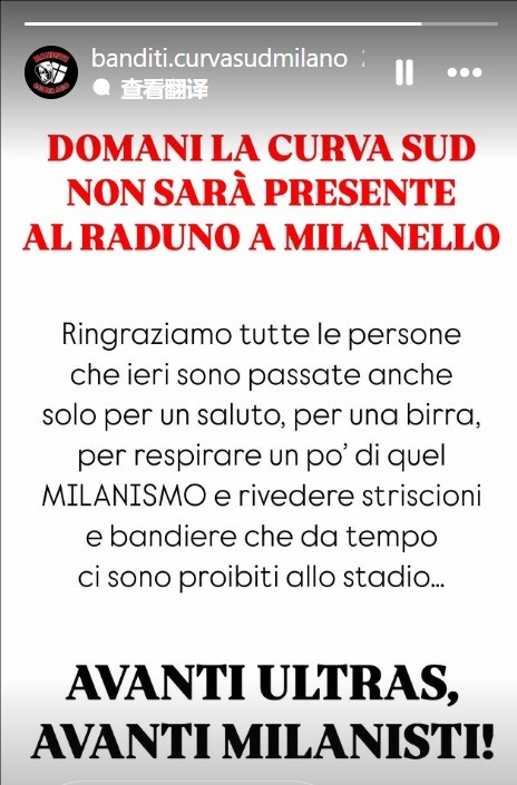 聲明中寫道:“明天我們不會(huì)在米蘭內(nèi)洛的季前首訓(xùn)時(shí)集結(jié)。我們感謝昨天(在南看臺(tái)年終聚會(huì)上)所有來訪的朋友,不管是來打個(gè)招呼、喝杯啤酒,還是為了感受那份‘米蘭主義’,并重新看到那些早已在球場被禁止的橫幅和旗幟……向前走,Ultras,向前走,紅黑米蘭主義者!”