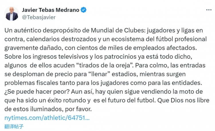 7月6日訊 西甲主席特巴斯社媒發(fā)文,繼續(xù)抨擊世俱杯。