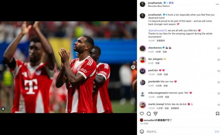 拜仁新援若納坦-塔在社媒發(fā)文寫(xiě)道:“失利讓人心痛,尤其是當(dāng)你覺(jué)得球隊(duì)本值得更進(jìn)一步的時(shí)候。我為成為這支球隊(duì)的一員感到無(wú)比驕傲,下賽季我們會(huì)以更強(qiáng)姿態(tài)回歸。穆西亞拉,我們都與你在一起,兄弟。感謝球迷在本屆賽事期間對(duì)我們難以置信的支持?!?/p>
