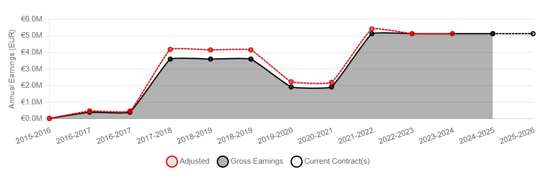 特奧職業(yè)生涯稅前基本年薪走勢圖