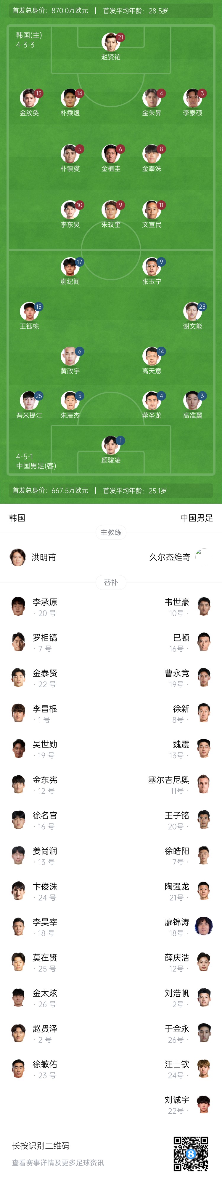 07月07日訊 北京時間今晚19點,東亞杯第1輪,中國男足vs韓國。賽前雙方公布了首發(fā)陣容,蒯紀聞、吾米提江迎來國足首秀,王鈺棟、顏駿凌出戰(zhàn),國足首發(fā)11人平均年齡25.1歲。