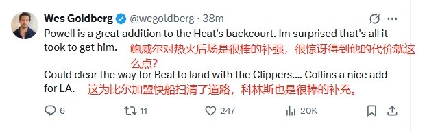 據(jù)ESPN名記Shams Charania報道,快船、爵士、熱火三方進(jìn)行重磅交易:約翰-科林斯轉(zhuǎn)投快船、諾曼-鮑威爾加盟熱火、凱文-樂福&李凱爾及2027年快船的次輪簽被送往爵士。美網(wǎng)友對此展開熱議,部分熱評如下: