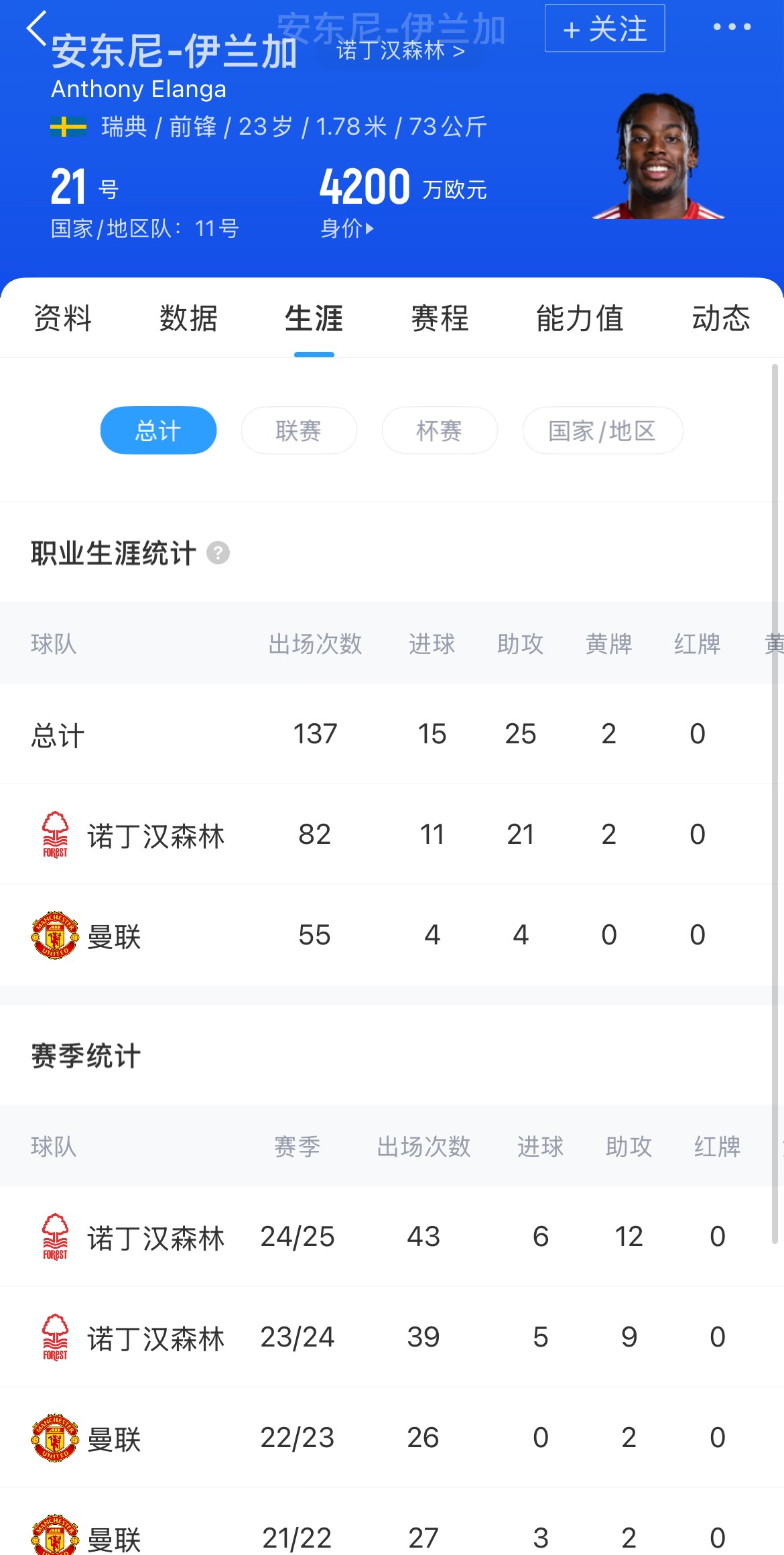 23歲的伊蘭加在24-25賽季為諾丁漢森林出戰(zhàn)了全部38場英超比賽,打入6球并貢獻(xiàn)11次助攻。