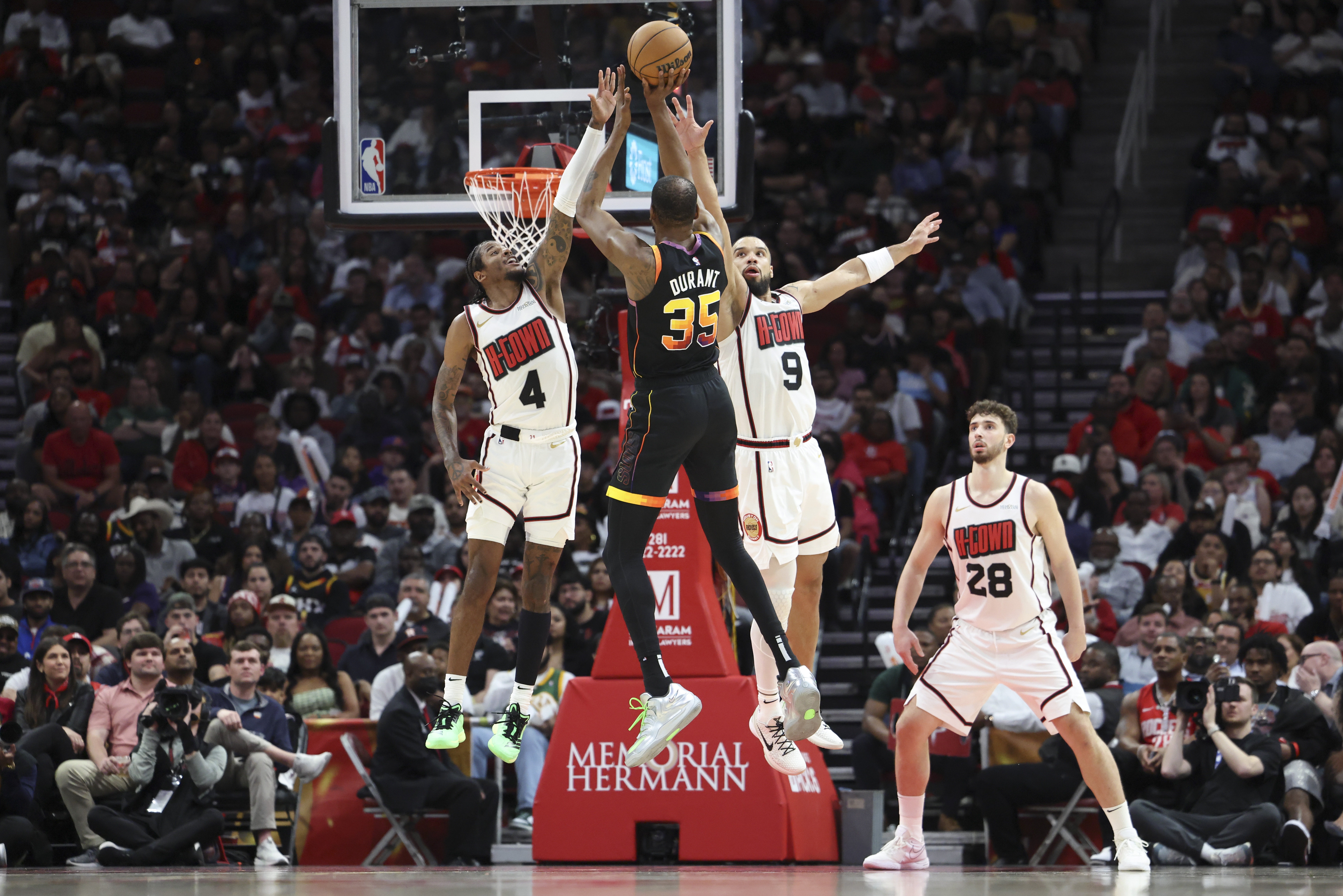 讓我們先從杜蘭特說起。盡管太陽隊上賽季經(jīng)歷了種種混亂,但他們?nèi)匀皇前雸鲞M攻排名前十的球隊,這簡直是個奇跡,而這要歸功于杜蘭特和他即便在36歲時依然保持的穩(wěn)定性。根據(jù)Cleaning the Glass的數(shù)據(jù),當杜蘭特在場時,太陽隊的進攻效率要高出對手6.2分,這一影響力超過了聯(lián)盟90%的球員。杜蘭特所在球隊的有效命中率會提升近6個百分點,這在他之前效力的每一支球隊都有著同樣的趨勢。在身邊有了更加出色的球員之后,杜蘭特應(yīng)該會使得火箭隊的數(shù)據(jù)飆升。從紙面上看,一位全能的得分手與活力十足的悍將、高球商的低位球員進行搭檔,這是一個無縫的配合。