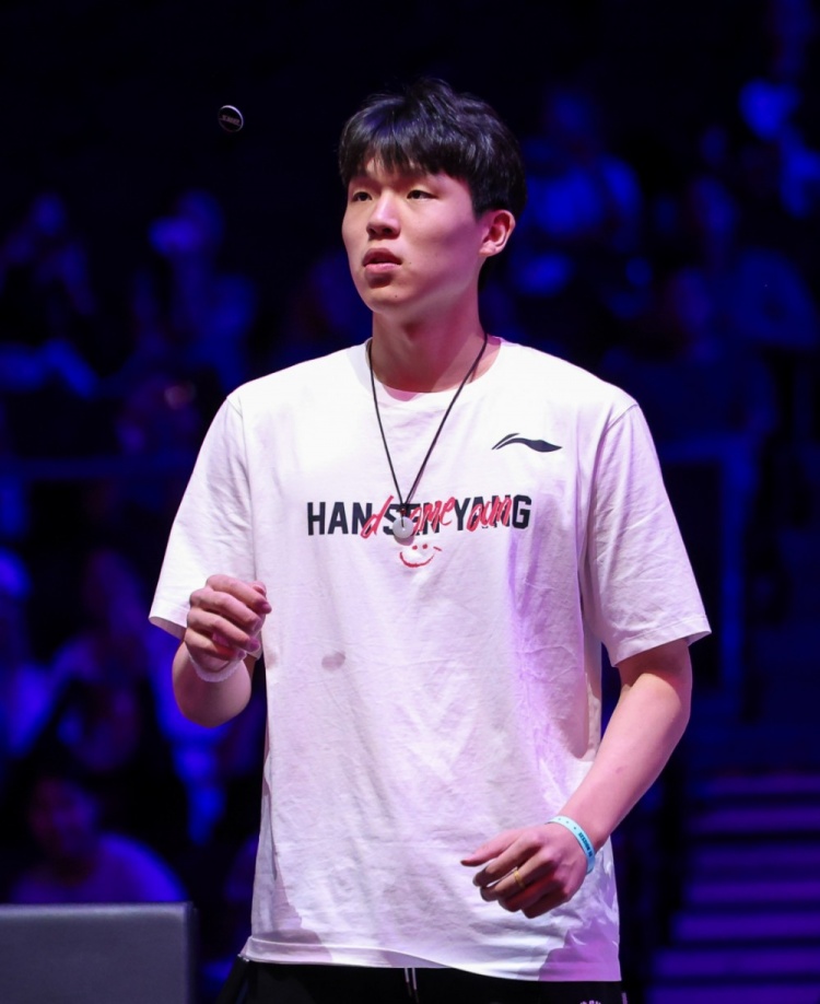 7月11日訊 乒乓球WTT美國大滿貫?zāi)袉?/8決賽,中國選手王楚欽對陣韓國選手李尚洙,楊瀚森來到現(xiàn)場為比賽挑邊。