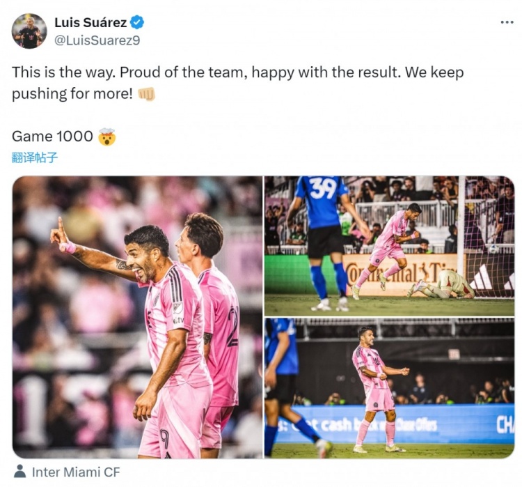 蘇亞雷斯社媒曬出比賽照片,并寫道:“就是這樣,為球隊感到驕傲,對結(jié)果感到滿意。我們再接再厲!第1000場比賽??”