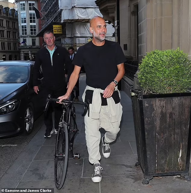 主帥瓜迪奧拉騎著自行車汗流浹背地來到派對現(xiàn)場。