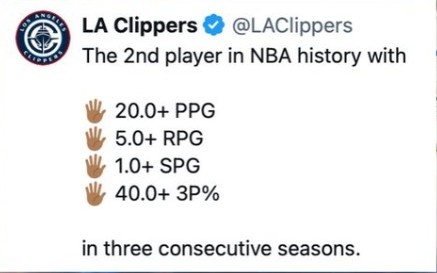 據(jù)官方統(tǒng)計(jì),萊昂納德連續(xù)三個(gè)賽季場(chǎng)均至少20分5籃板1搶斷,且三分命中率40%+,NBA歷史第二人,第一是拉里-伯德。