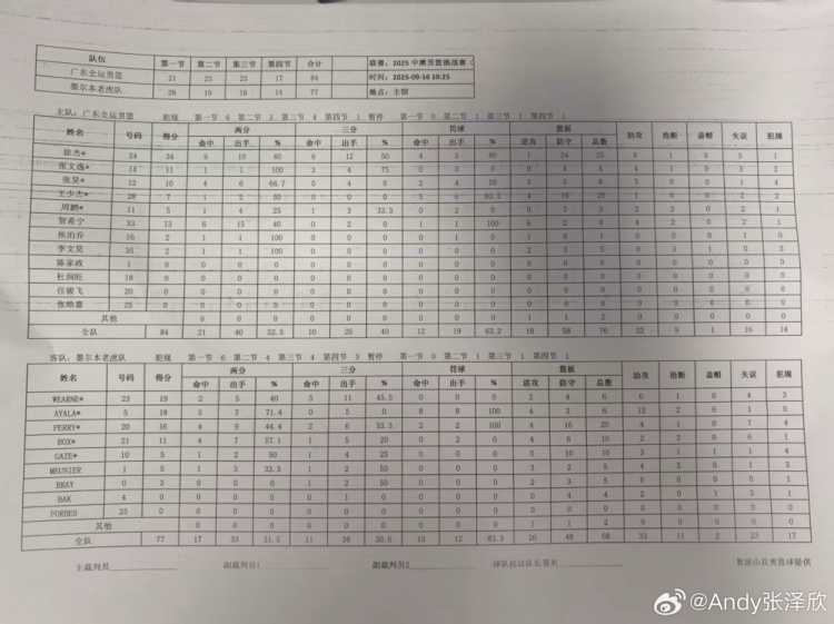 比賽結(jié)束后,媒體人@Andy張澤欣 在社媒上曬出了一張本場比賽的數(shù)據(jù)統(tǒng)計,這是一張離譜的統(tǒng)計表,其中顯示,廣東男籃58個后場籃板,而表中其它數(shù)據(jù)又顯示墨爾本老虎隊今天一共打了43鐵(兩分16鐵,三分25鐵,罰球2鐵)??。