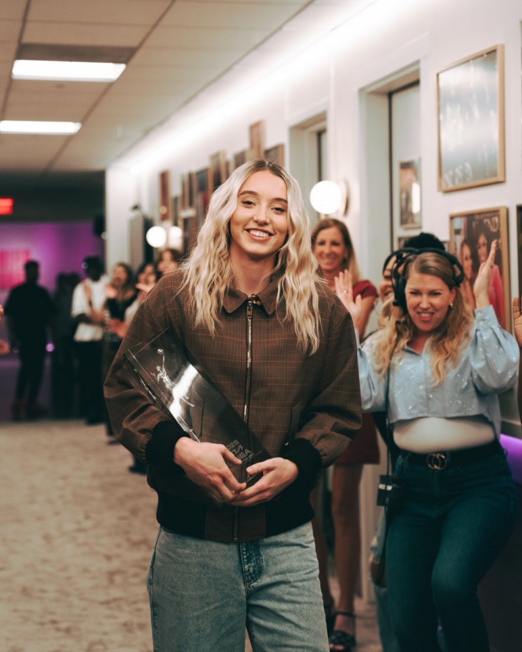 而在公布獲獎的同時,佩奇-布克斯也出現(xiàn)在了《The Jennifer Hudson Show》節(jié)目中,也在這從WNBA總裁凱茜-恩格波特手中接過了最佳新秀獎杯。