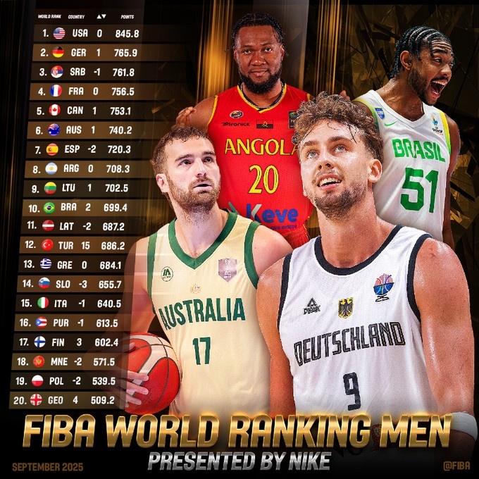 9月18日訊 今天,F(xiàn)IBA官方更新了男籃世界排名,美國隊仍然排名第一,德國隊升至第2,塞爾維亞隊降至第3。
