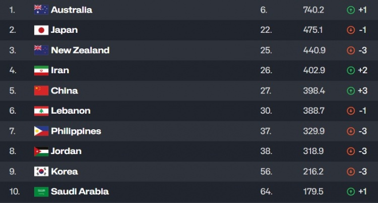 中國隊排名第27,上升了3位。