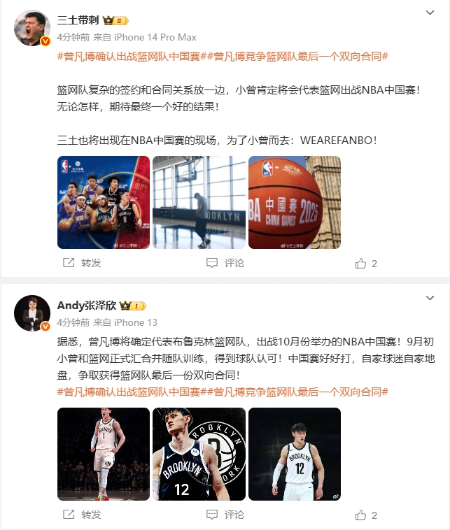 媒體人@Anay張澤欣和@三土帶刺也有類似報道,其中前者表示曾凡博9月初和籃網(wǎng)會合隨隊訓練,得到球隊認可。
