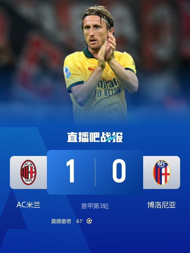 9月15日訊 北京時間9月15日凌晨2:45,2025-26賽季意甲聯(lián)賽第3輪,AC米蘭坐鎮(zhèn)圣西羅球場迎戰(zhàn)博洛尼亞。上半場坎比亞吉破門但因越位在先無效,埃斯圖皮尼安和S-希門尼斯中柱,米蘭暫0-0博洛尼亞;下半場邁尼昂傷退,莫德里奇打進(jìn)個人米蘭生涯首球,里奇和S-希門尼斯中柱,恩昆庫禁區(qū)內(nèi)摔倒,VAR介入,主裁判取消點(diǎn)球判罰并向阿萊格里出示紅牌,最終AC米蘭1-0博洛尼亞,聯(lián)賽兩連勝。
