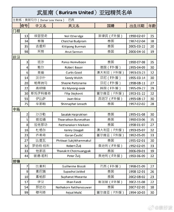 9月15日訊 新賽季亞冠精英聯(lián)賽即將打響,武里南聯(lián)公布28人參賽名單,球隊共有15位外援,前亞泰球員彼得-祖伊在列。小組賽階段,武里南聯(lián)與海港、蓉城、申花三支中超球隊都將有交手。
