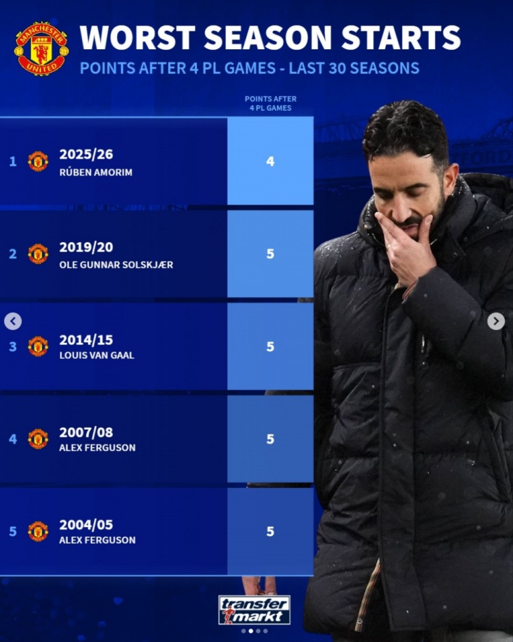 新賽季聯(lián)賽前4輪僅取得4分,創(chuàng)曼聯(lián)過去30個(gè)賽季聯(lián)賽最差開局。