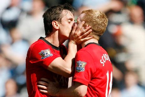 2010年4月,斯科爾斯在曼市德比最后時刻打入制勝球,幫助曼聯(lián)1-0取勝。進球后,他和內(nèi)維爾在場上親吻,震驚全場。