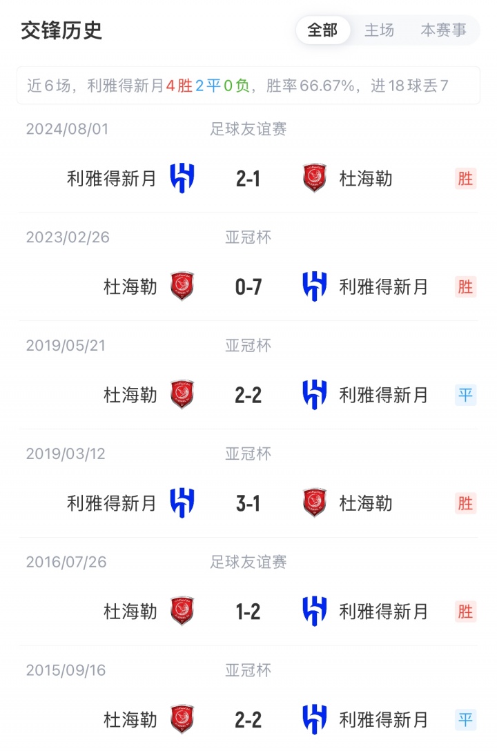 新月目前沙特聯(lián)1勝1平積4分排第5,杜海勒卡塔聯(lián)1勝1平2負積4分排第7。新月亞冠中對陣杜海勒已6場不?。?勝3平)。