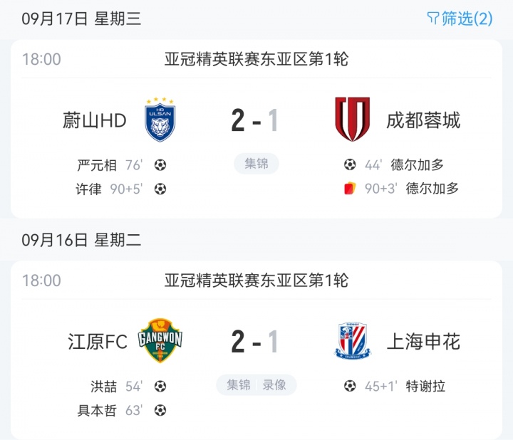 中超頭名蓉城1-2蔚山 次名海港半場0-3神戶 第三的申花1-2江原
