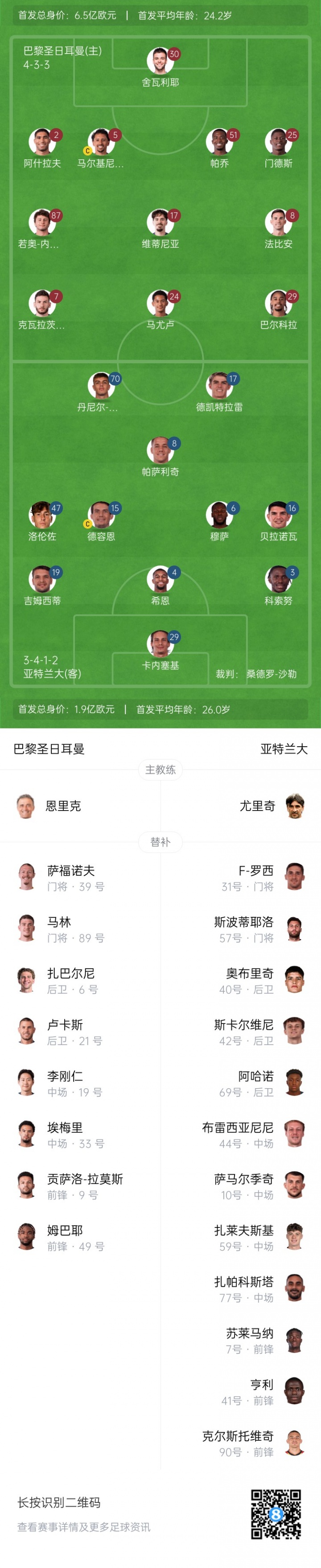 9月18日訊 今天凌晨3點,歐冠首輪,巴黎圣日耳曼主場迎戰(zhàn)亞特蘭大。賽前雙方公布首發(fā)名單。