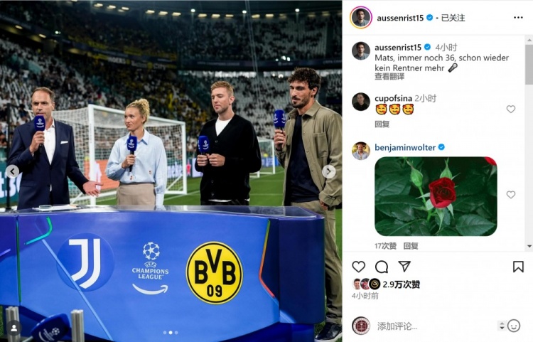 曾效力多特的德國足壇名宿胡梅爾斯參與了這場比賽的現(xiàn)場評述工作,退役不久的他在社交媒體上曬出照片,配文:“馬茨(胡梅爾斯),依然36歲,不再是退休人士了。”