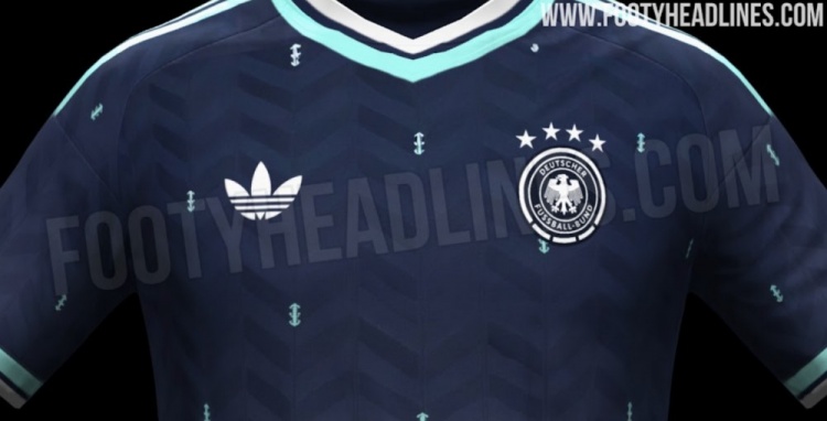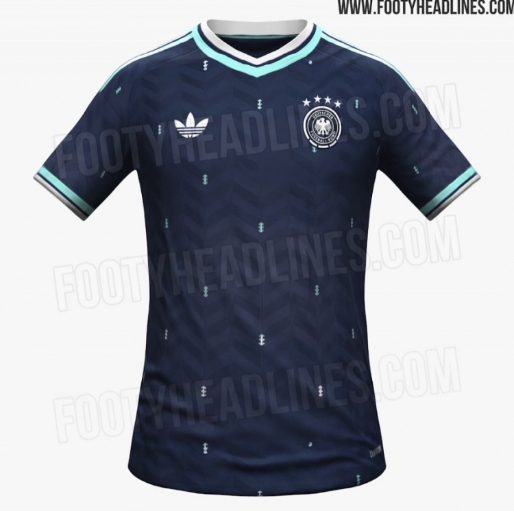 阿迪達(dá)斯為德國隊(duì)設(shè)計(jì)的2026年世界杯客場球衣將以深海軍藍(lán)為主色調(diào),搭配白色標(biāo)志、薄荷色細(xì)節(jié)和鋸齒狀圖案。