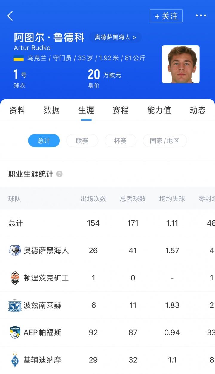 魯?shù)驴片F(xiàn)年33歲,曾效力基輔迪那摩、帕福斯、頓涅茨克礦工等隊,他未入選過烏克蘭國家隊,代表烏克蘭U20、U21出過場。