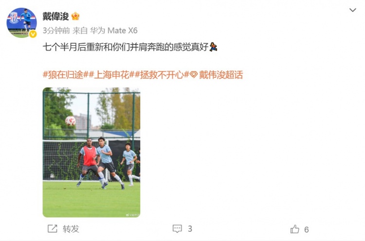今天,戴偉浚在個(gè)人社媒曬出一張他參加球隊(duì)合練的照片,并配文:七個(gè)半月后重新和你們并肩奔跑的感覺真好。