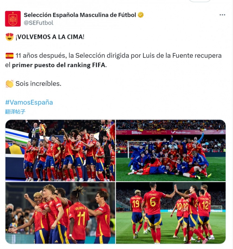 西班牙隊官方社媒曬出球員們的照片,配文:“我們重回巔峰!德拉富恩特執(zhí)教的西班牙隊時隔11年重返FIFA排名第一的位置,你們太棒了!”
