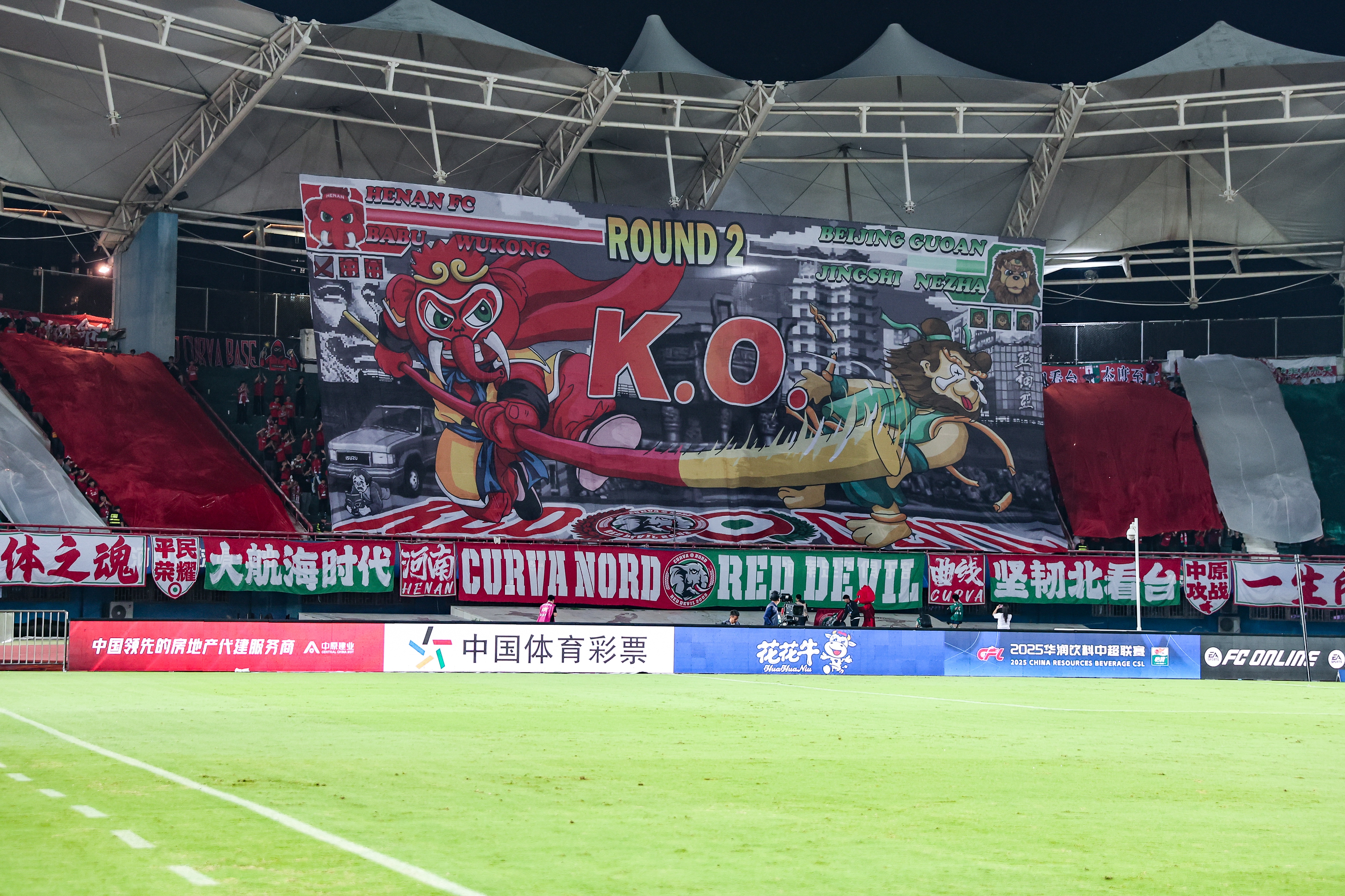 以下為9月12日河南主場(chǎng)vs國(guó)安的現(xiàn)場(chǎng)TIFO。有媒體人指出,TIFO左下角的圖案元素不合規(guī)。