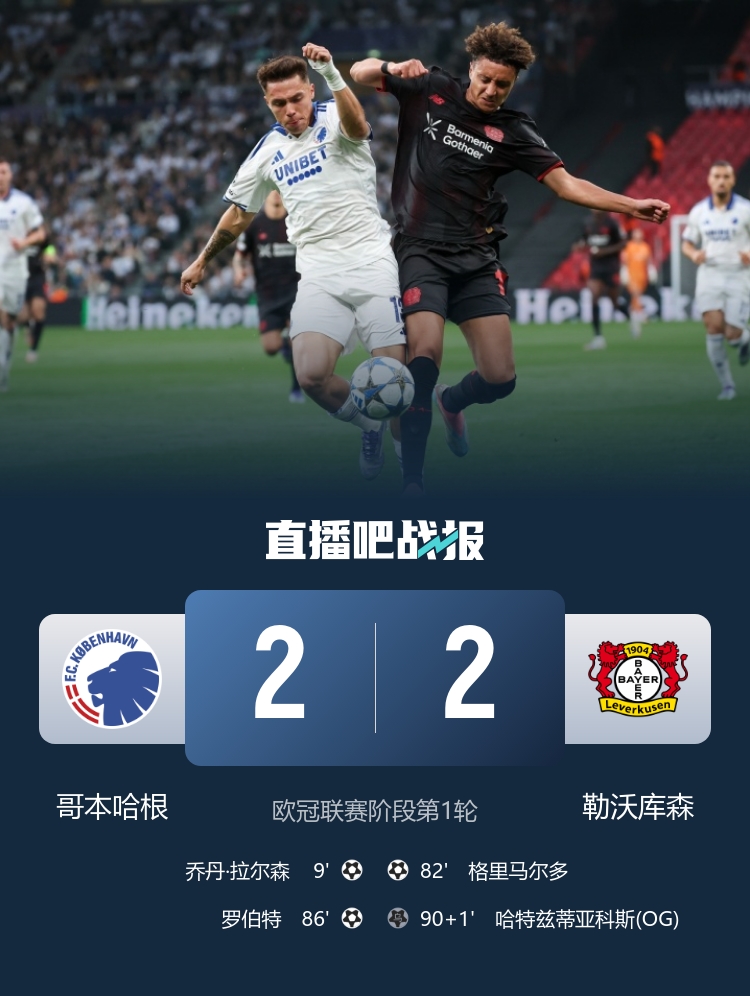 全場(chǎng)比賽結(jié)束,哥本哈根2-2勒沃庫(kù)森。