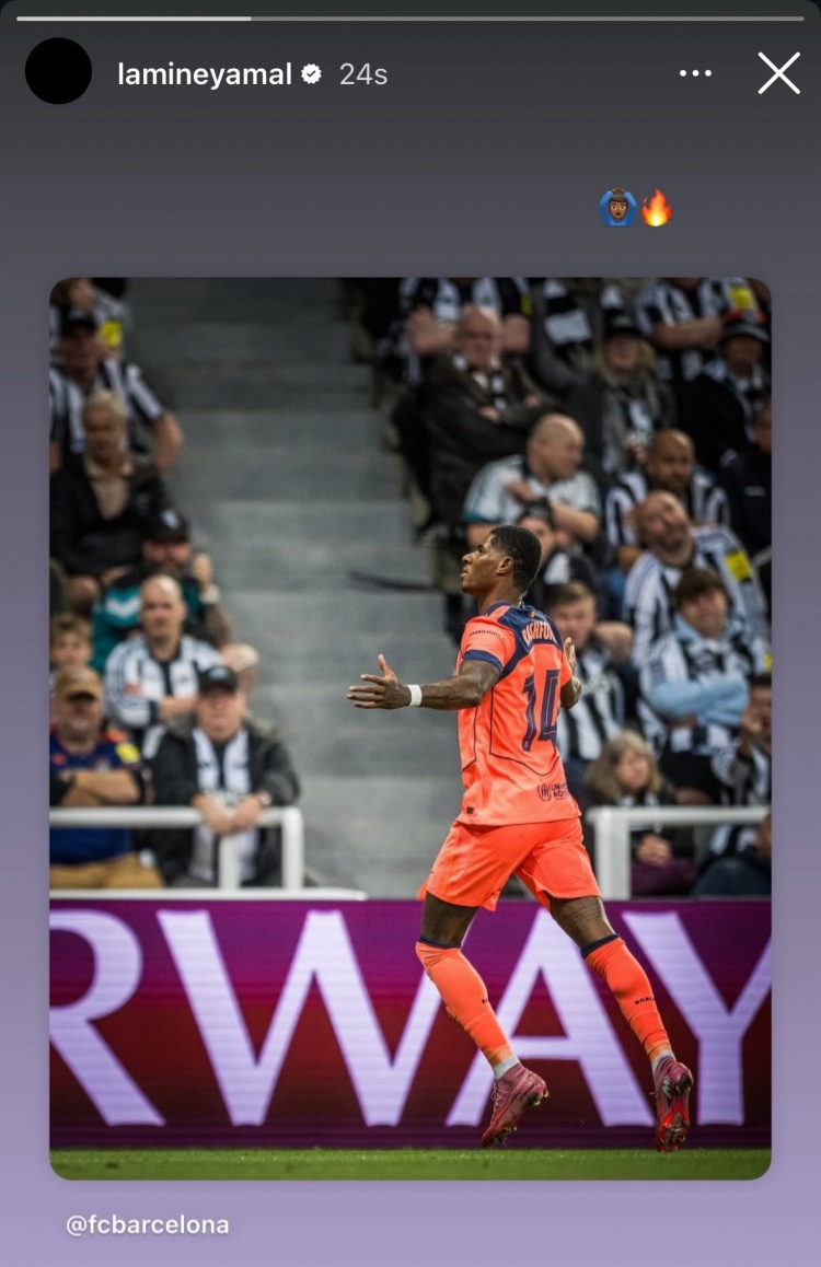 拉什福德在對(duì)陣紐卡的比賽中完成梅開二度,因傷缺席本場(chǎng)比賽的亞馬爾也在社交媒體上曬出了拉什福德的慶祝照。