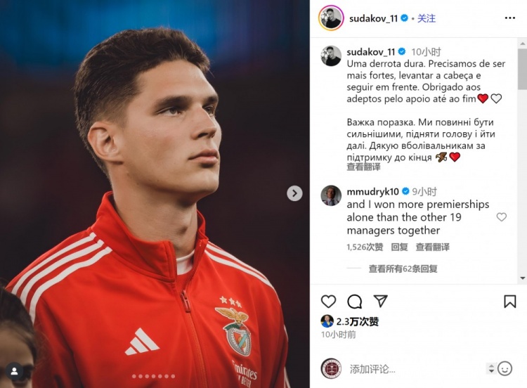 效力于本菲卡的烏克蘭中場蘇達科夫賽后在ins上寫道:“一場慘痛的失利,我們需要更堅強,昂首挺胸繼續(xù)前進,感謝球迷們直到最后的支持?!?/p>