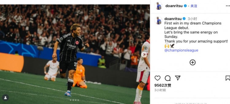 賽后堂安律在社媒曬出比賽照,紀念自己的歐冠首秀,他寫道:“歐冠首秀如夢似幻,并且順利取勝。讓我們將這股勢頭帶到周天的聯(lián)賽吧。感謝你們熱情似火的支持!”