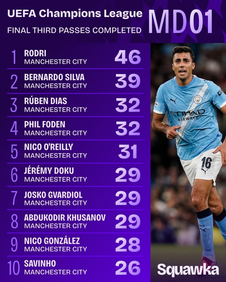 9月19日訊 著名數(shù)據(jù)網(wǎng)站Squawka統(tǒng)計了歐冠首輪進攻三區(qū)傳球數(shù)據(jù),羅德里46次居首,曼城球員包攬前十。