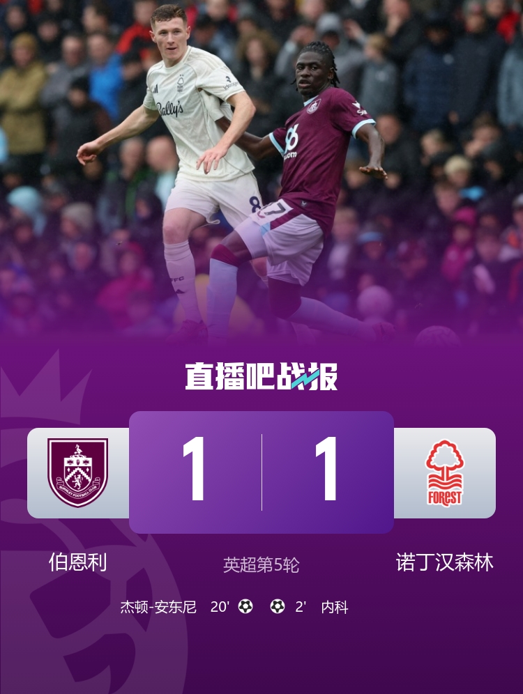 全場比賽結束,伯恩利1-1諾丁漢森林。