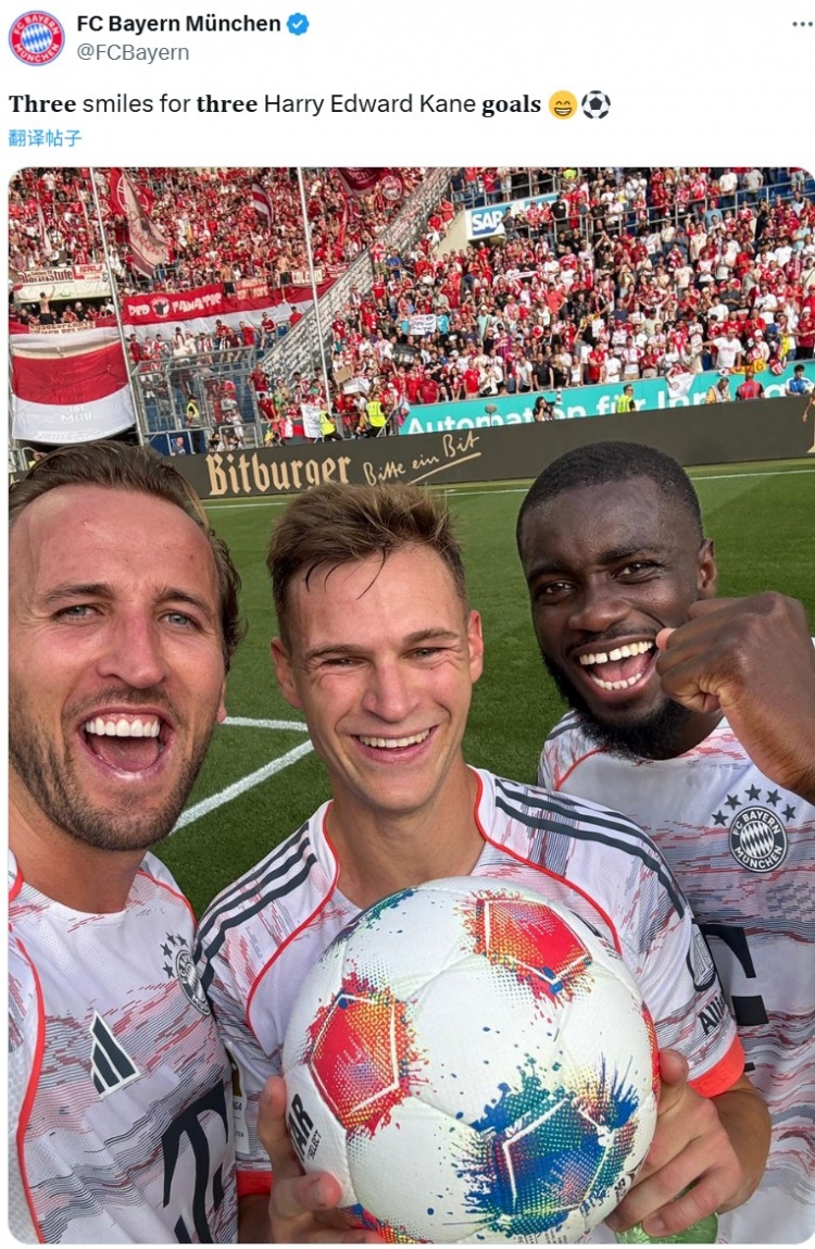 本場(chǎng)比賽凱恩上演帽子戲法,拜仁官推也在賽后曬出凱恩與隊(duì)友基米希、于帕以及比賽用球的合影。