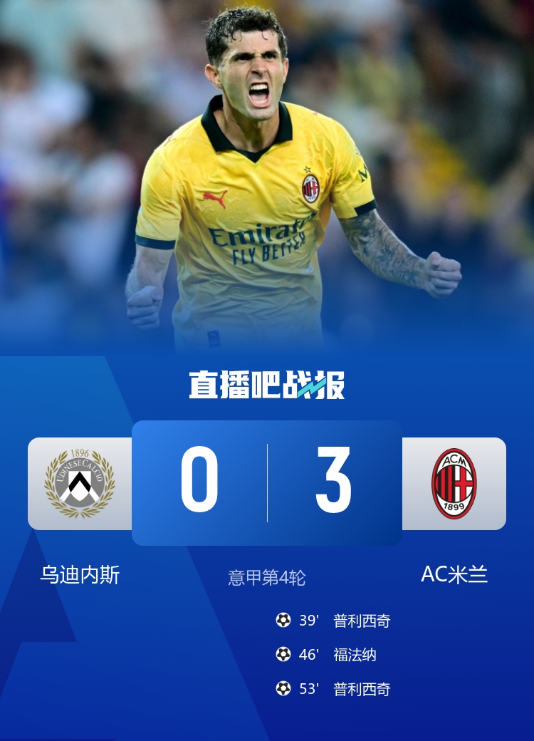 9月21日訊 意甲第4輪,烏迪內(nèi)斯坐鎮(zhèn)主場弗里烏利體育場迎戰(zhàn)AC米蘭。上半場,普利西奇先拔頭籌,希門尼斯失單刀。易邊再戰(zhàn),福法納破門,普利西奇雙響。最終烏迪內(nèi)斯0-3米蘭。積分榜方面烏迪內(nèi)斯7分第五,米蘭9分暫第三。