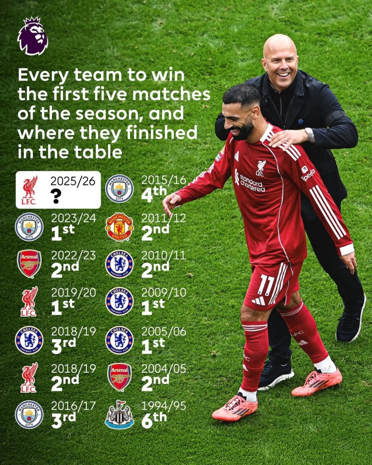 據(jù)英超官方統(tǒng)計,英超歷史上共有14支球隊賽季開局5連勝(包括本賽季利物浦),此前做到這點的13支球隊之中,4支球隊最終贏得當(dāng)賽季英超冠軍,分別是切爾西(2次)、利物浦和曼城。