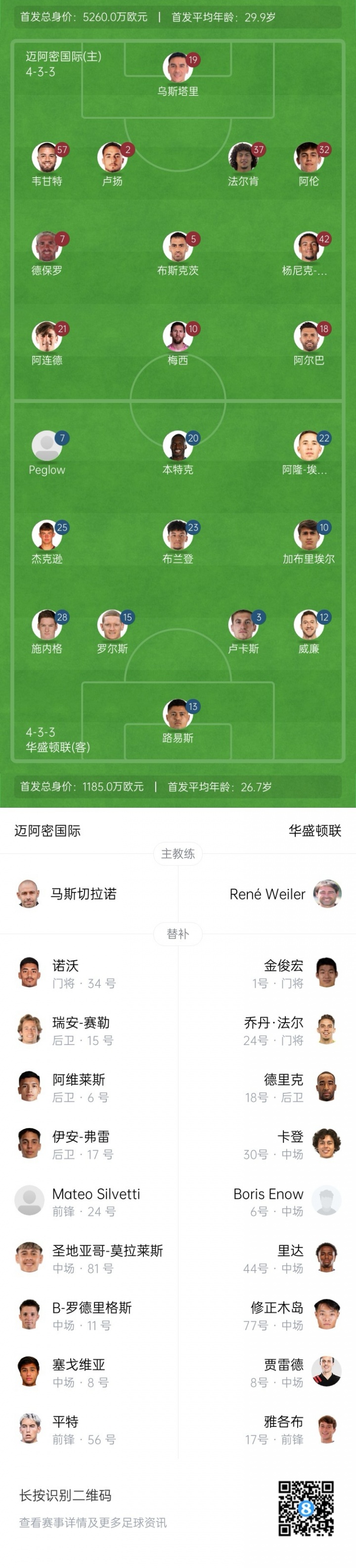 邁阿密國際替補(bǔ):34-諾沃、17-弗雷、15-瑞安-賽勒、81-圣地亞哥·莫拉萊斯、6-阿維萊斯、56-平特爾、8-特拉斯科、11-B·羅德里格斯、24-馬特奧·西爾維蒂