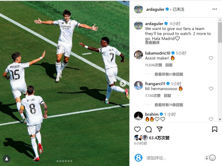 居勒爾社媒曬出與隊(duì)友一起慶祝的照片,配文:“我們想成為球迷引以為豪的球隊(duì),還剩兩場,Hala Madrid!”
