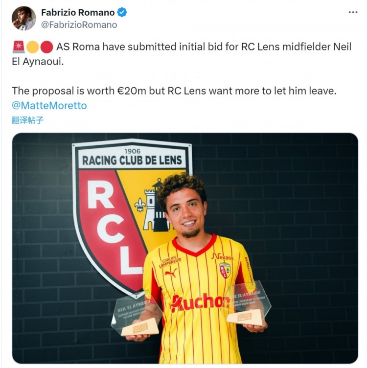 羅馬諾透露,羅馬對(duì)朗斯24歲中場埃納奧伊感興趣,已經(jīng)向朗斯提交了2000萬歐的首份報(bào)價(jià),但朗斯想要更多轉(zhuǎn)會(huì)費(fèi)。