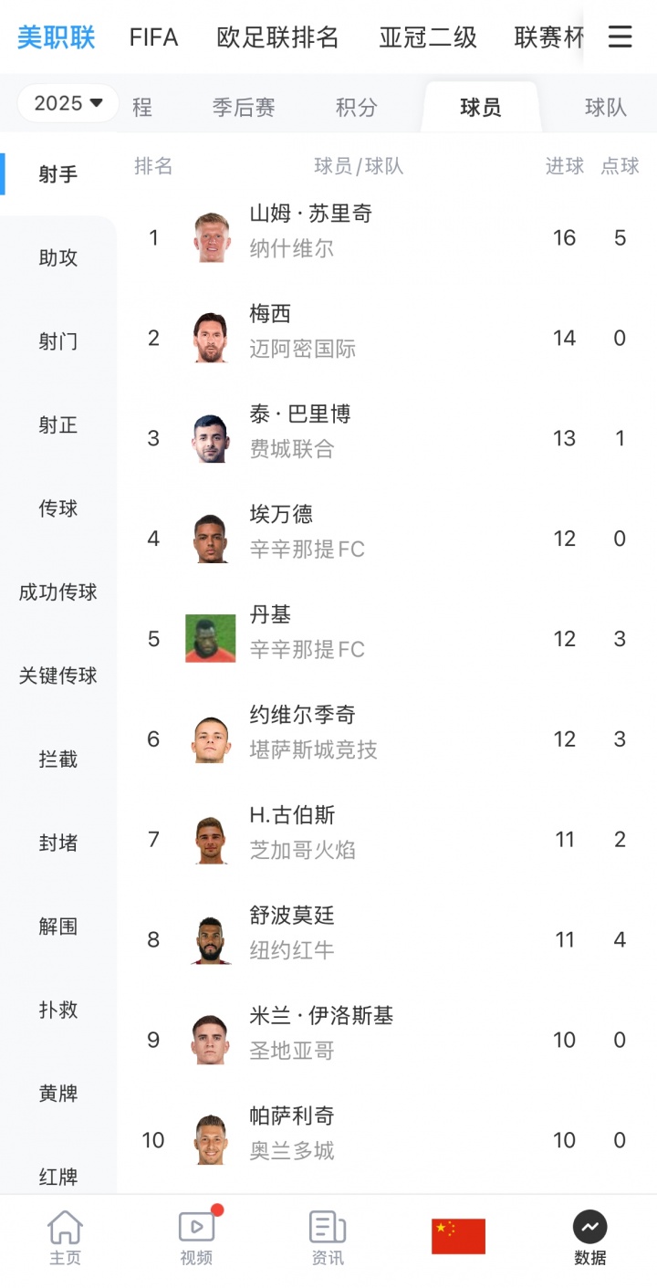 目前美職聯(lián)射手榜上,梅西14球(0點球)排在第二。